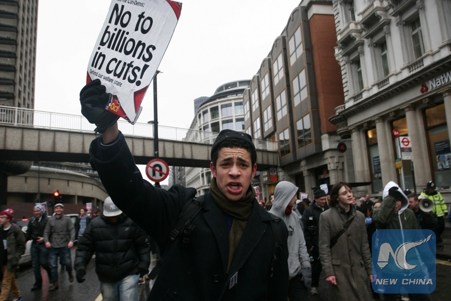 A student holds a placard during a protest against raising tuition fees in central London, Britain, Nov. 30, 2010. Demonstrations were held in cities across the UK, the third time since Nov. 10, to protest against plans to raise tuition fees in England to up to 9,000 pounds per year, with a vote expected in the House of Commons before Christmas. (Xinhua/Bimal Gautam)