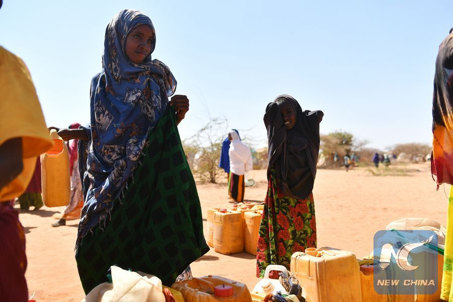File photo shows girls wait in line to get water at an Internal Displaced Person camp in Doolow, a border town with Ethiopia, Somalia, on March 19, 2017. (Xinhua/Sun Ruibo)