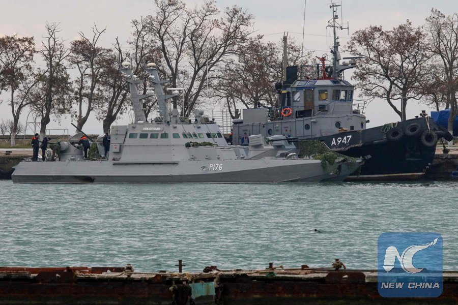 In this file photo taken on Nov. 26, 2018, seized Ukrainian military vessels are seen in a port of Kerch, Crimea. (Xinhua/AFP)