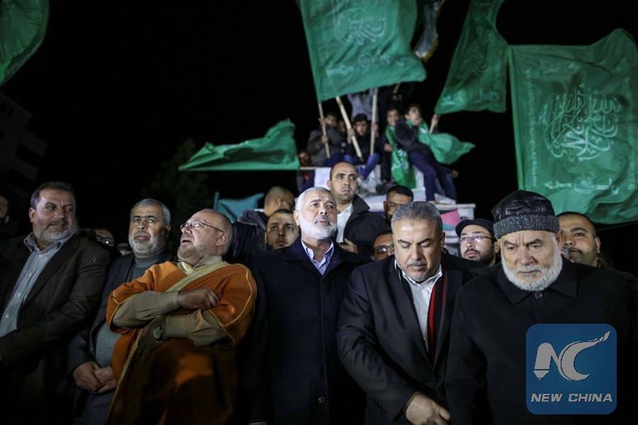 Ismail Haniyeh (C), chief of the Hamas movement, takes part in a protest against the U.S. decision to recognize Jerusalem as Israel's capital, in Gaza City, on Dec 6, 2017. (Xinhua/Wissam Nassar)