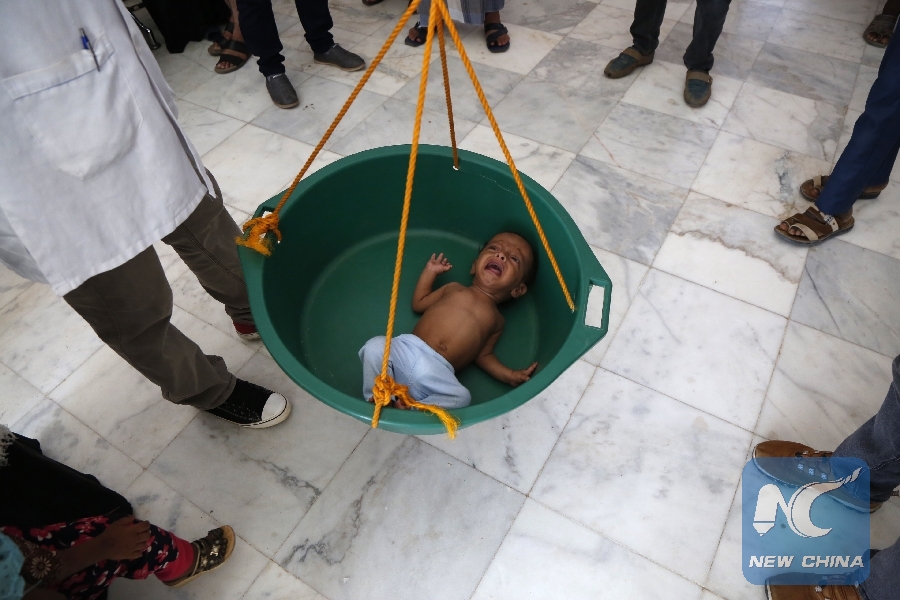 File Photo: A doctor checks a malnourished girl at a hospital in Hajjah province, Yemen, Oct. 1, 2018. (Xinhua/Mohammed Mohammed)