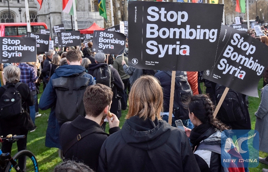 File Photo: Anti-war demonstrators protest against a coalition missile strike in Syria launched by the U.S., France and Britain, at the Parliament Square in London, Britain, on April 16, 2018. (Xinhua/Stephen Chung)