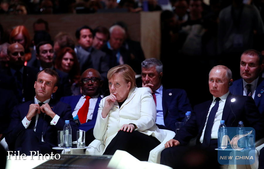 French President Emmanuel Macron, German Chancellor Angela Merkel and Russian President Vladimir Putin attend the opening session of the Paris Peace Forum as part of the commemoration ceremony for Armistice Day, 100 years after the end of the First World War, in Paris, France, November 11, 2018. (REUTERS PHOTO)