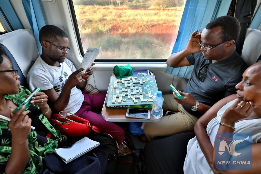 Passengers play scrabble on a train of Kenya's Mombasa-Nairobi Standard Gauge Railway (SGR), on June 2, 2018. (Xinhua/Wang Teng)