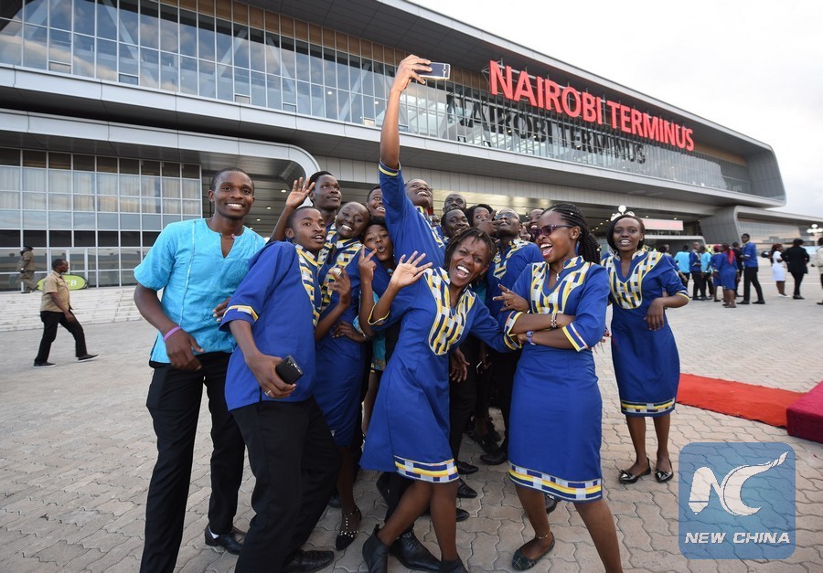 Performers pose for photos at Nairobi Terminus of the Mombasa-Nairobi Standard Gauge Railway (SGR) in Nairobi, capital of Kenya, May 31, 2017. (Xinhua/Chen Cheng)