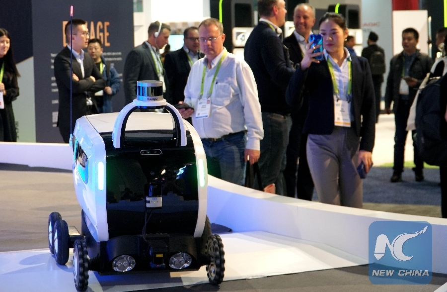 People watch the Autonomous Delivery of Meituan, a Chinese internet giant, during the Consumer Electronics Show (CES) in Las Vegas, the United States, Jan. 8, 2019. (Xinhua/Wu Xiaoling)