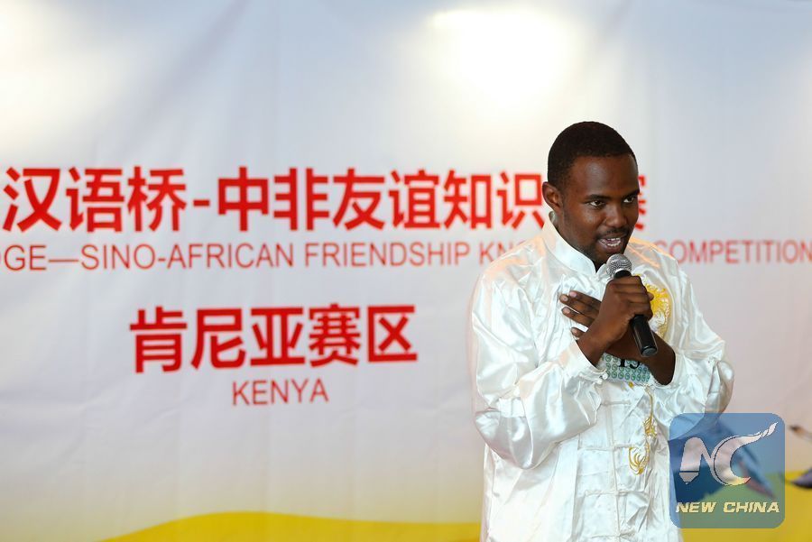 File photo shows a Kenyan student delivers a speech in mandarin at the Sino-African Friendship Knowledge Competition, in the Confucius Institute at the University of Nairobi, Kenya, on Oct. 14, 2015. (Xihua/Pan Siwei)