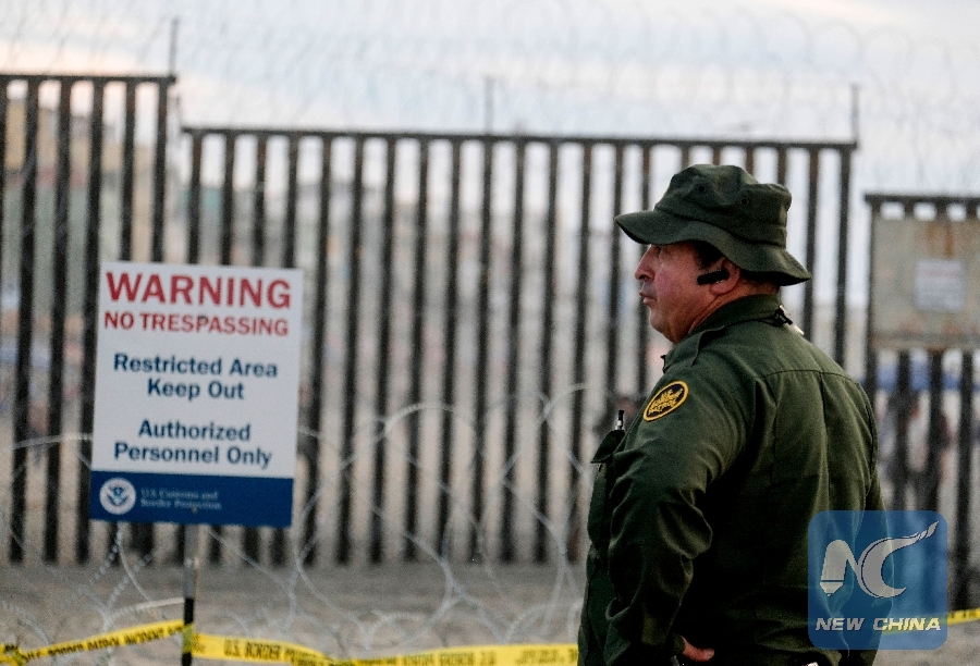 File Photo: A U.S. Border Patrol agent stands in front of the border fence that divides the U.S. and Mexico in San Diego, California, the United States, Nov. 17, 2018. (Xinhua/Zhao Hanrong)