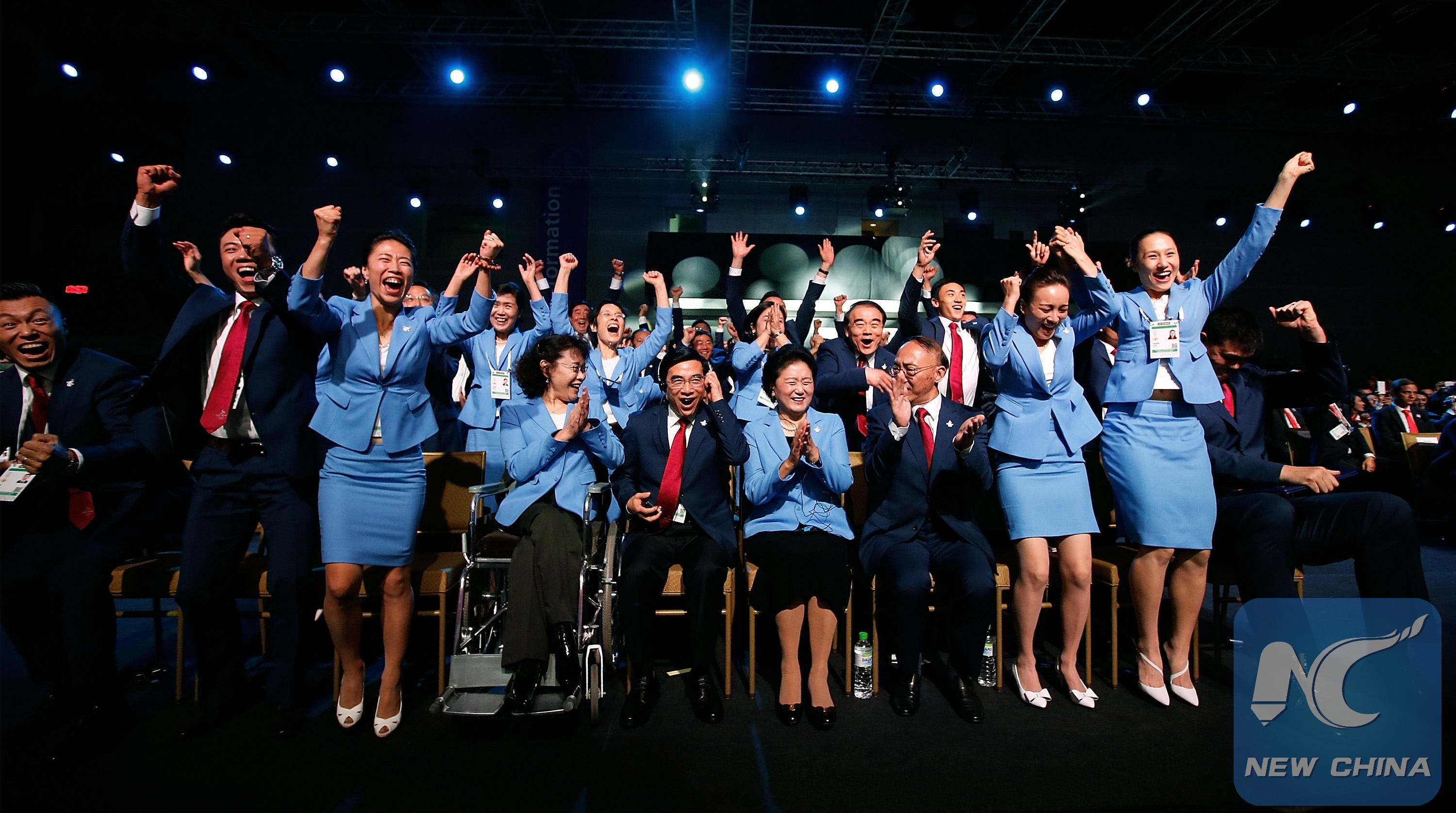 Photo taken on July 31, 2015 shows members of Beijing 2022 Winter Olympic Games bid delegation celebrating after Beijing won the bid at the 128th International Olympic Committee session in Kuala Lumpur, Malaysia. (Xinhua/Wang Lili)