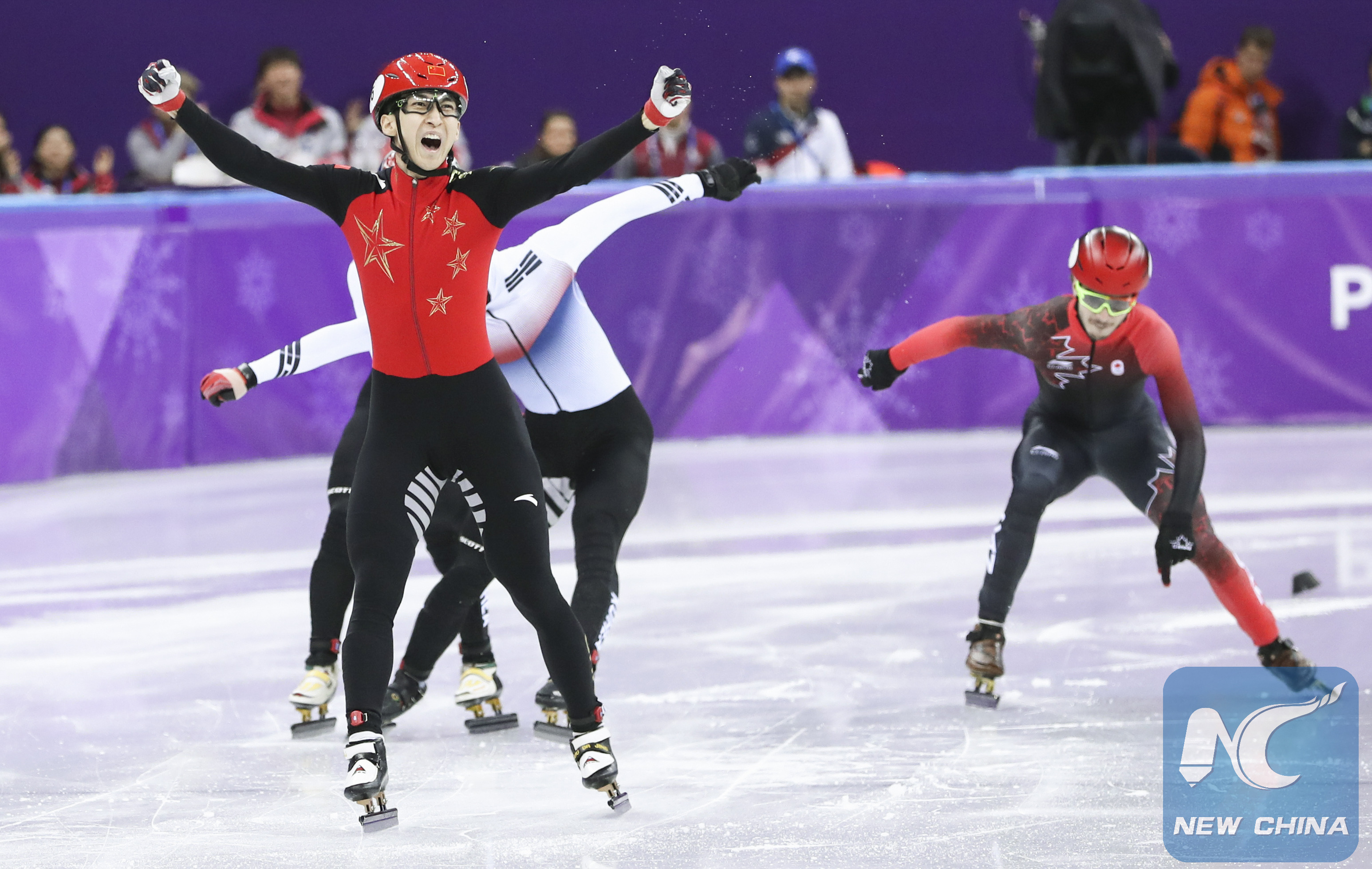 Photo taken on Feb. 22, 2018 shows Wu Dajing (L) of China celebrating victory after men's 500m final of short track speed skating at the 2018 PyeongChang Winter Olympic Games at Gangneung Ice Arena, Gangneung, South Korea. (Xinhua/Han Yan)