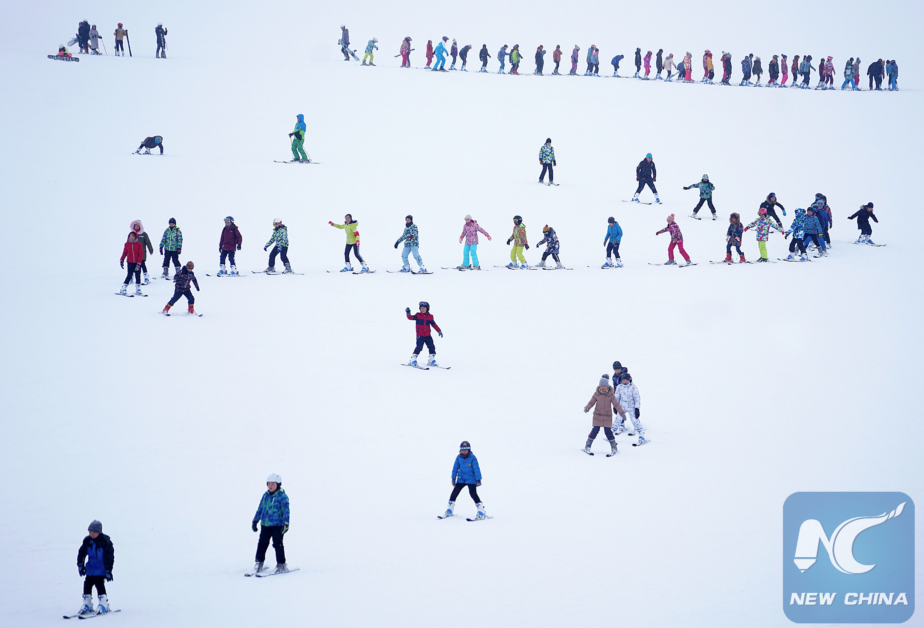 Photo taken on Dec. 20, 2018 shows pupils practising skiing in a ski resort in Altay, northwest China's Xinjiang Uyghur Autonomous Region. (Xinhua/Han Yuqing)