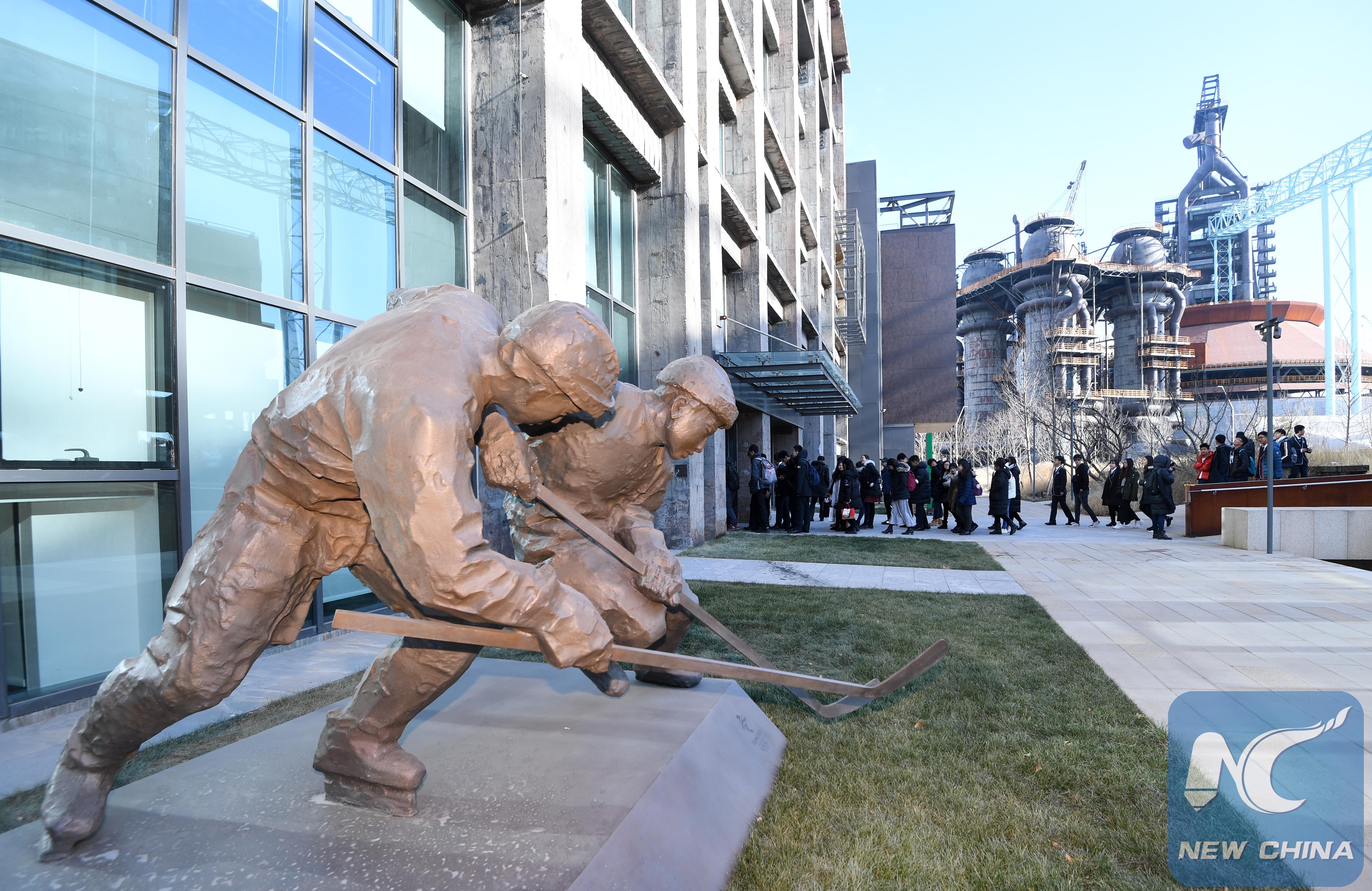Photo taken on Jan. 22. 2019 shows a statue of ice hockey at the headquarters of Beijing 2022 Olympic Games Organizing Committee in Shougang Industrial Park, Beijing. (Xinhua/Chen Yehua)