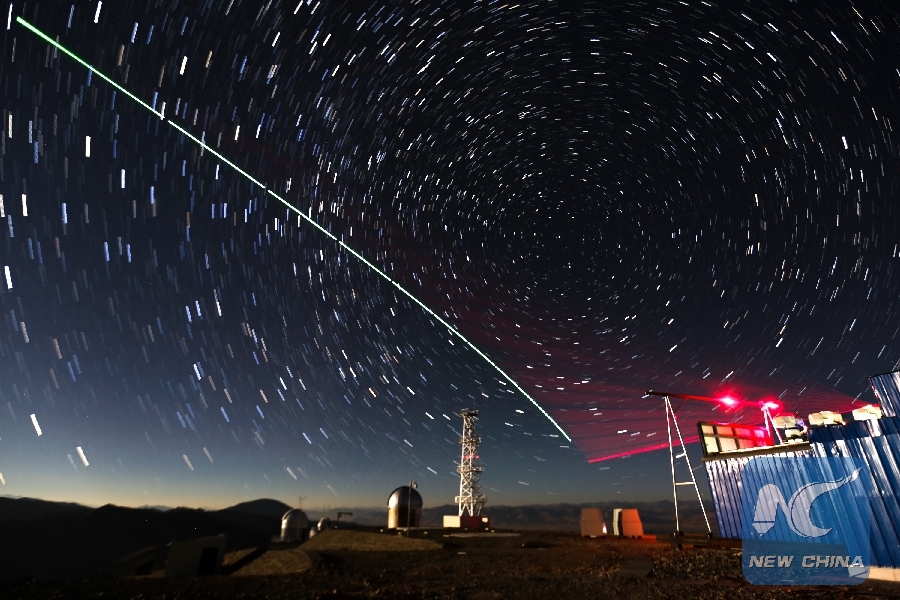Composite photo taken on Dec. 9, 2016 shows a satellite-to-earth link established between quantum satellite "Micius" and the quantum teleportation experiment platform in Ali, southwest China's Tibet Autonomous Region. Dubbed "Father of Quantum" by some in China, Pan Jianwei and his team harnessed quantum laws to transmit information securely, called quantum communications. (Xinhua/Jin Liwang)