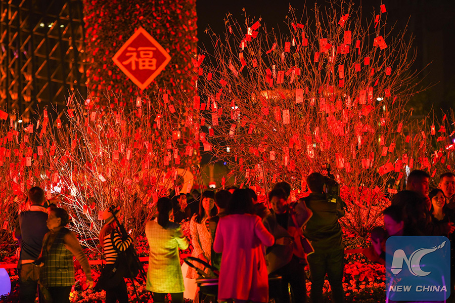 People view a tree full of red packets in Guangzhou, capital city of south China's Guangdong Province, Jan. 25, 2017, before the Spring Festival. (Xinhua/Liu Dawei)