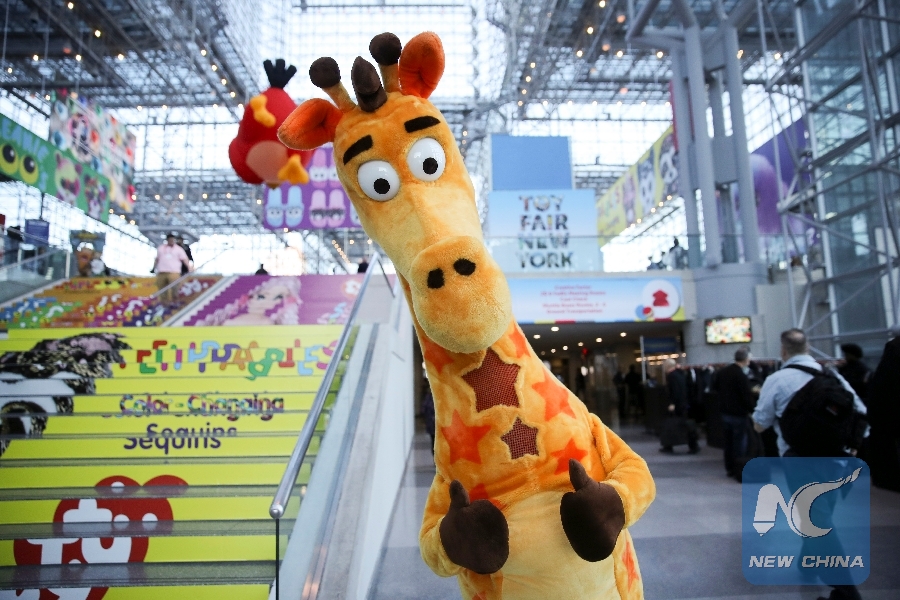 Personnel with giraffe costume pose at the 116th Annual North American International Toy Fair at the Jacob K. Javits Convention Center in New York, the United States, Feb. 16, 2019. (Xinhua/Wang Ying)