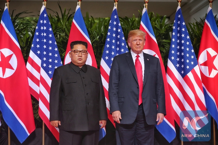 File Photo: Top leader of the Democratic People's Republic of Korea (DPRK) Kim Jong Un (L) meets with U.S. President Donald Trump in Singapore, on June 12, 2018. (Xinhua/The Straits Times)