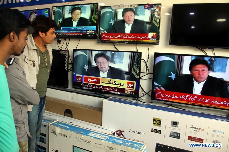 People watch a televised speech of Pakistani Prime Minister Imran Khan in Karachi, Pakistan, on Feb. 27, 2019. Imran Khan on Wednesday invited India for dialogue to counter terrorism and reduce tensions between the two neighbors. (Xinhua)