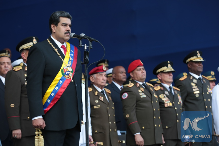 File Photo: Venezuelan President Nicolas Maduro (front) inspects the armed forces after the presidential inauguration ceremony in Caracas, Venezuela, on Jan. 10, 2019. (Xinhua)