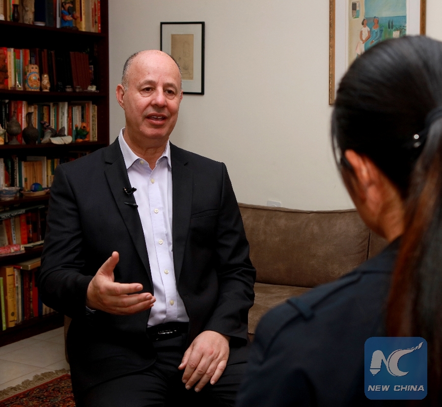 Tzachi Hanegbi, Israeli minister for regional cooperation, is receiving an interview with Xinhua in Mevaseret Zion near Jerusalem, Israel, on March 13. (Xinhua)