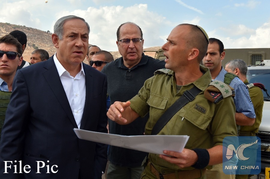 Israeli Prime Minister Benjamin Netanyahu (L, Front) and Defense Minister Moshe Ya'alon (C) listen to a briefing during a visit to the West Bank, on Oct. 6, 2015. (Xinhua File photo)