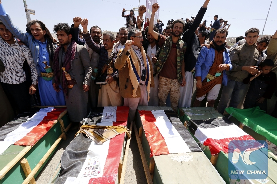 People stand by coffins of victims of the Sunday's explosion during a funeral at a cemetery in Sanaa, Yemen, on April 10, 2019. (Xinhua/ Mohammed Mohammed)