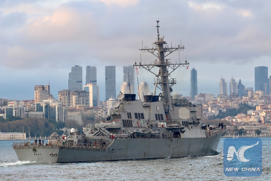 U.S. Navy guided-missile destroyer U.S.S. Ross sails in the Bosphorus, on its way to the Black Sea, in Istanbul, Turkey, April 14, 2019. (Xinhua/REUTERS)