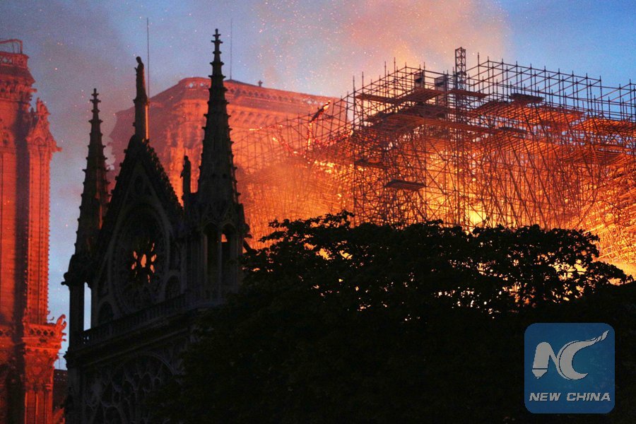 The Notre Dame Cathedral is on fire in central Paris, capital of France, on April 15, 2019. The fire at the Notre Dame on Monday afternoon destroyed the spire of the 850-year-old historical cathedral. (Xinhua/Gao Jing)