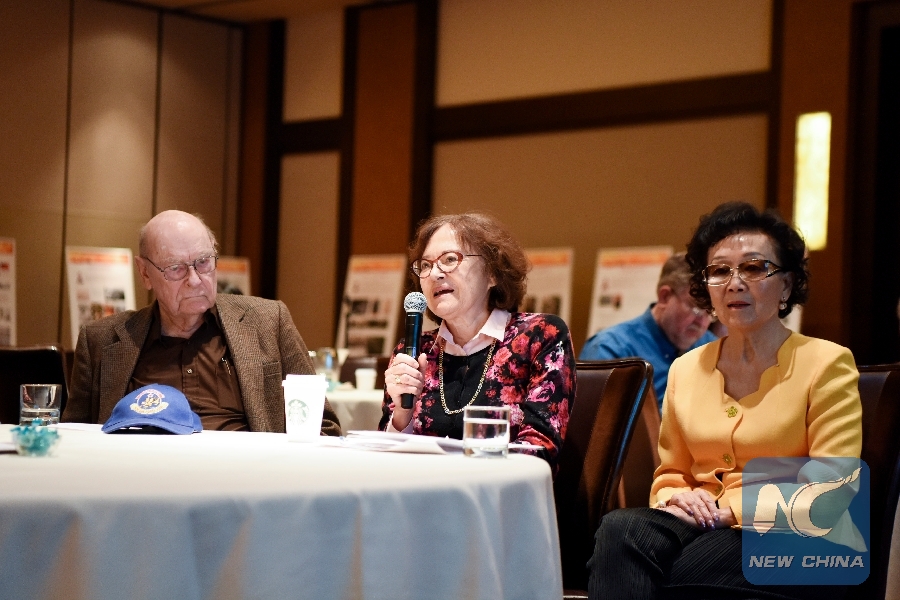 Cynthia Chennault (C), daughter of late U.S. General Claire Lee Chennault, speaks during the 4th Sino-American Second World War Friendship and Flying Tiger History Conference in Las Vegas, the United States, May 11, 2019. (Xinhua/Han Fang)