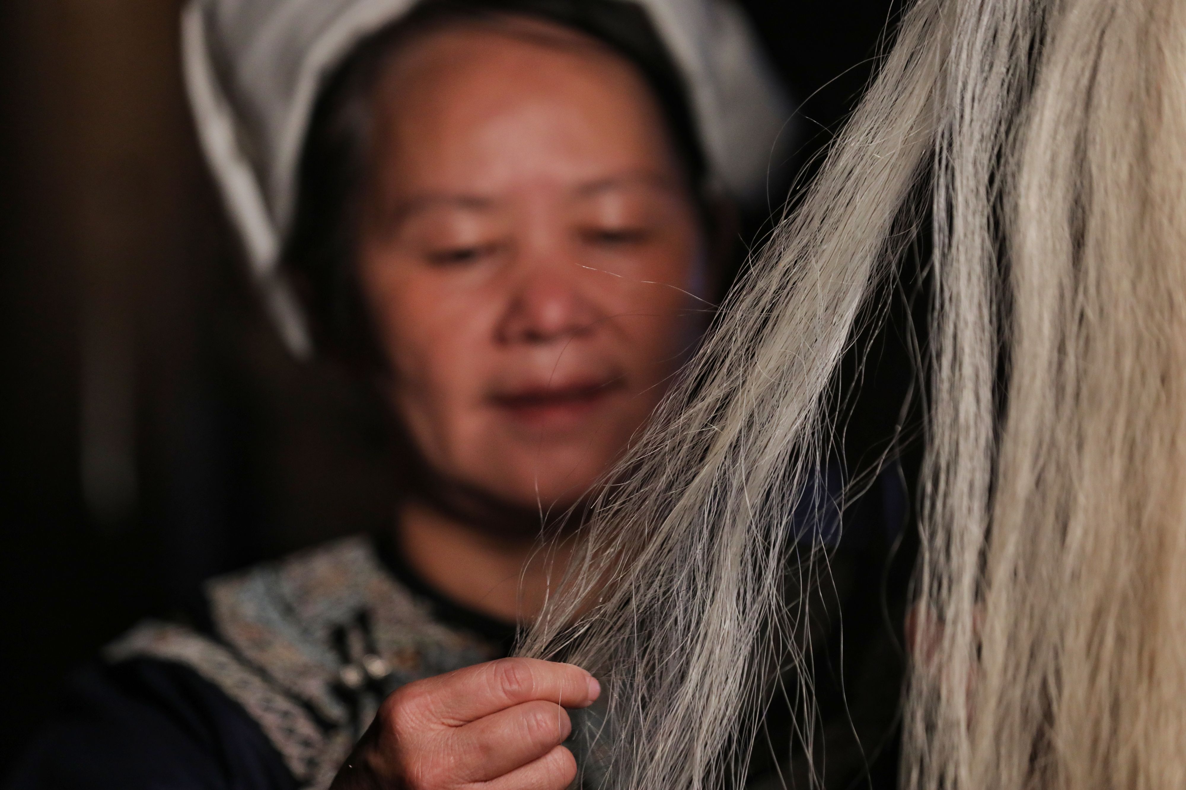 Wei Taohua picks horse tail fibers to make sewing threads for the traditional horse tail embroidery. (Xinhua/Ou Dongqu)