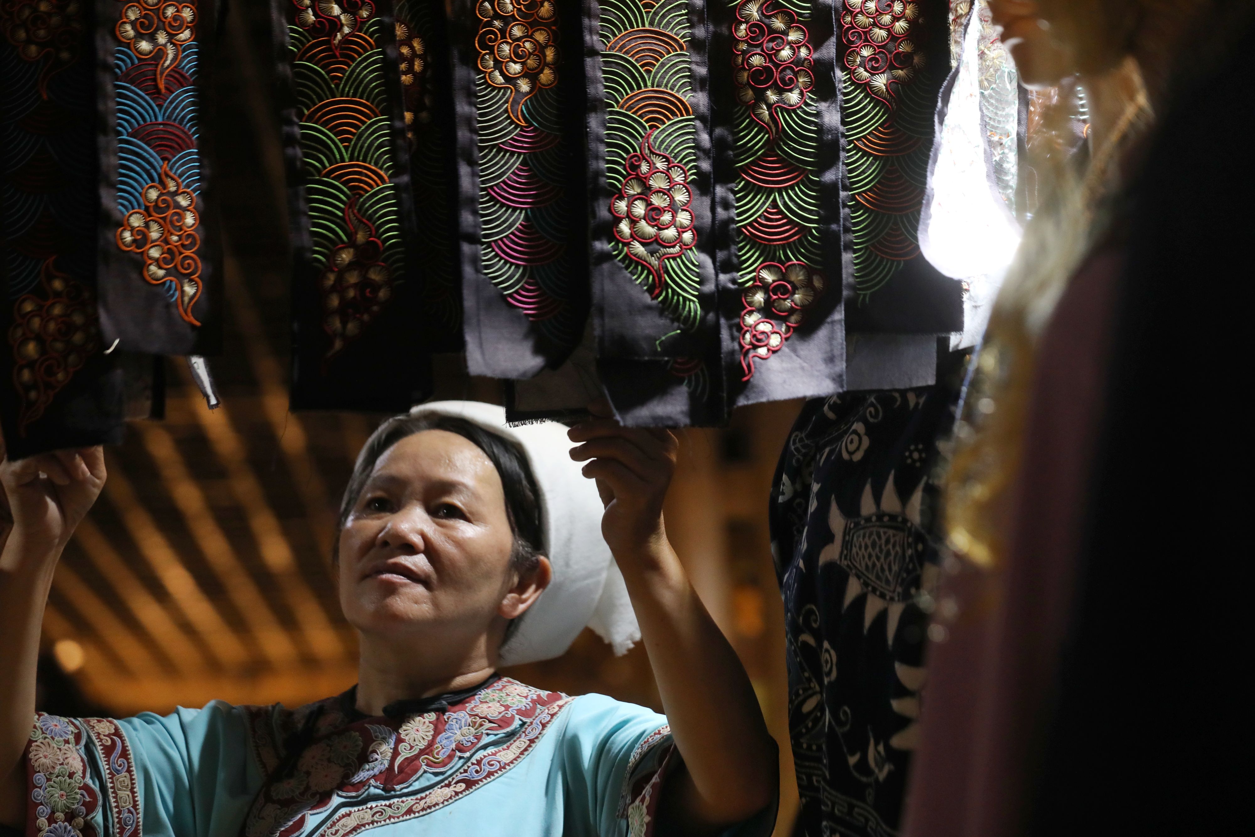 Wei Taohua shows a piece of finished horse tail embroidery. (Xinhua/Ou Dongqu)