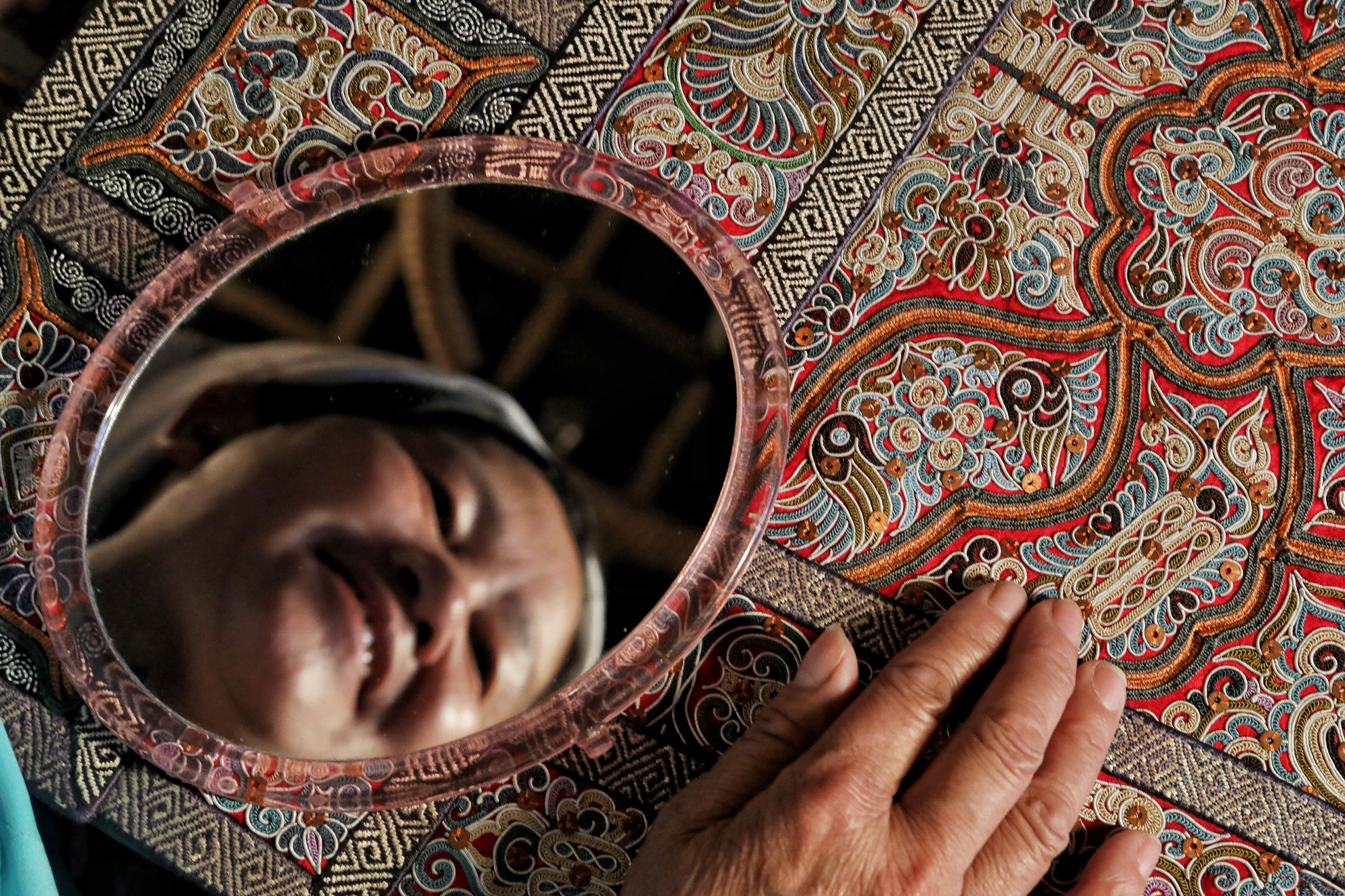 Wei Taohua is pictured in this inverted image while drawing needlework sketches for the traditional horse tail embroidery. (Xinhua/Ou Dongqu)