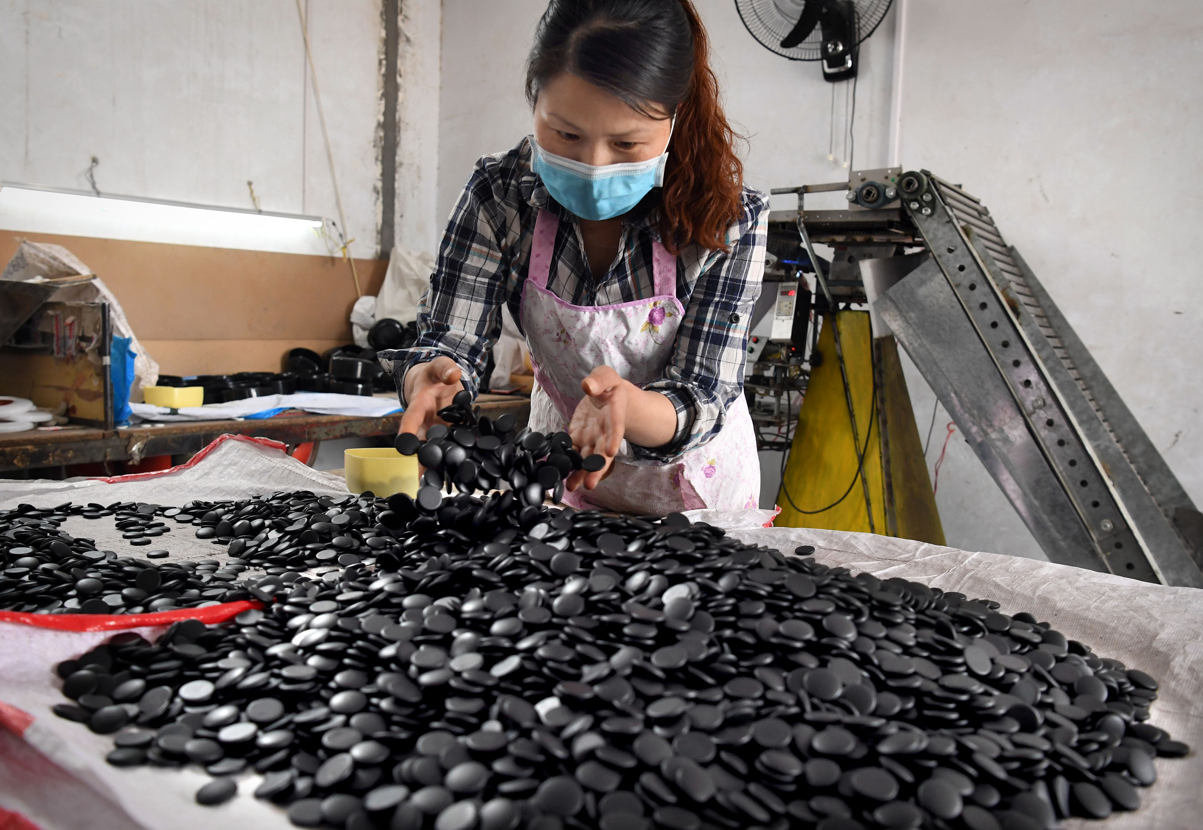 A staff member selects black pieces of Go (Weiqi) at Shuangyuan weiqi company in central China's Henan Province, May 14, 2019. (Xinhua/Li An)