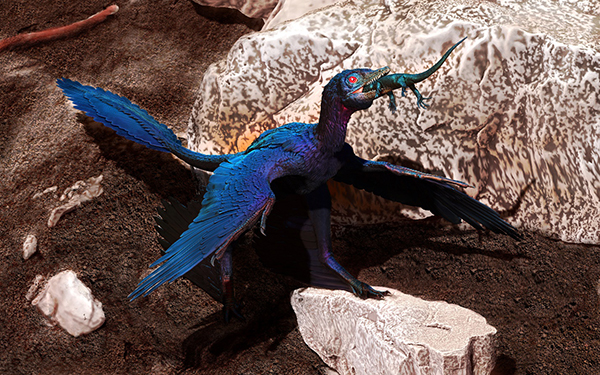 Photo shows the reconstructed scene of the microraptor swallowing the lizard. Photo provided by the Institute of Vertebrate Paleontology and Paleoanthropology under the Chinese Academy of Sciences