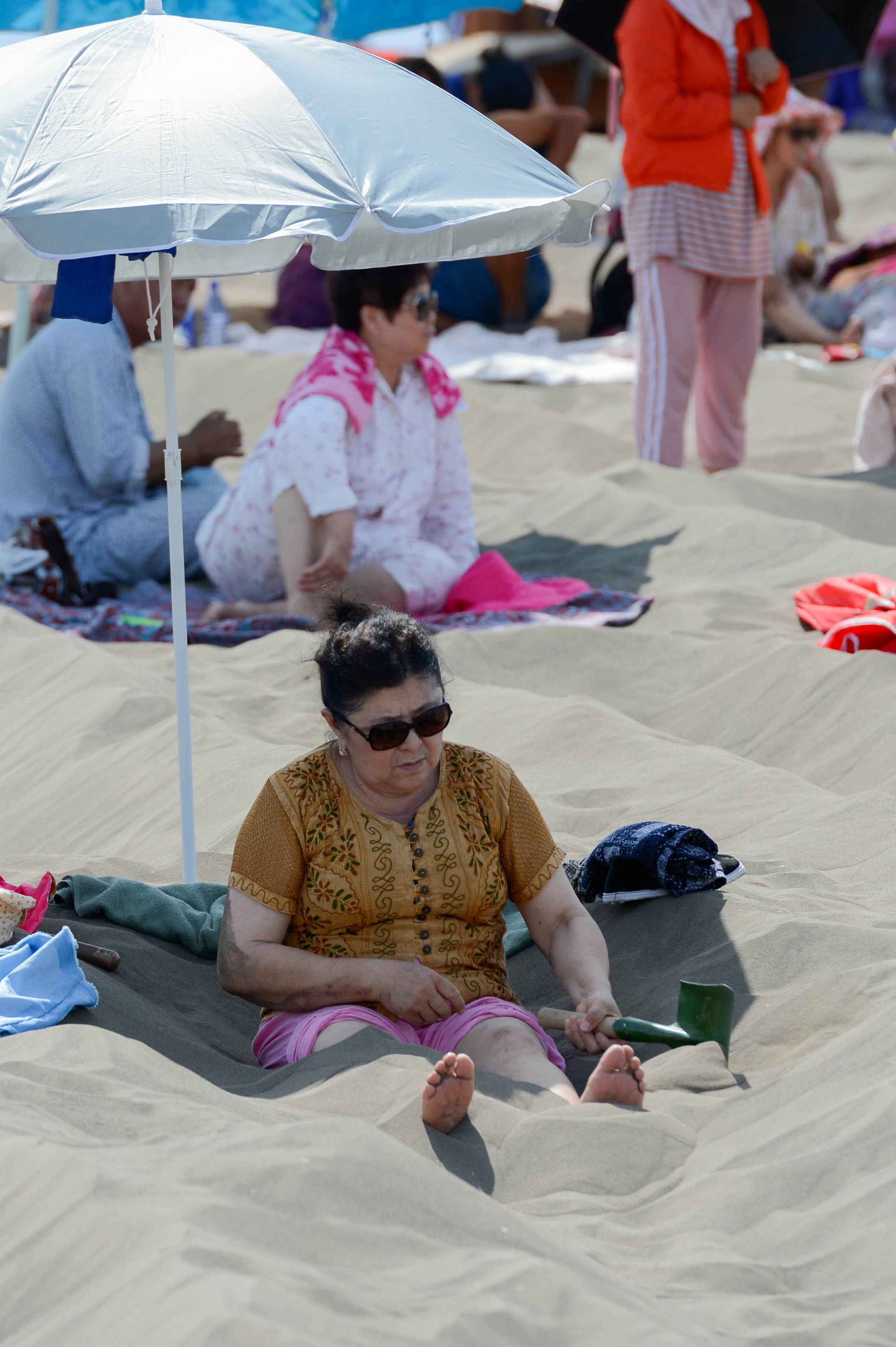 Tourists experience sand therapy. (Xinhua/Ding Lei)