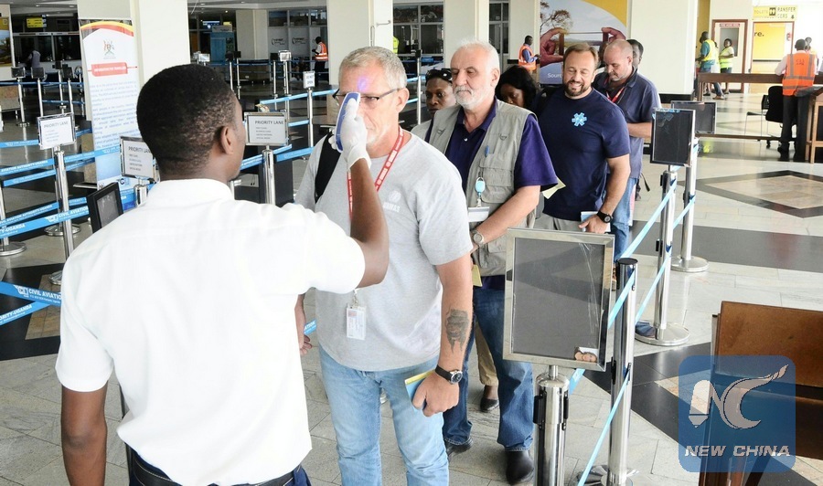File photo shows passengers queue to be screened at Uganda's Entebbe International Airport on May 15, 2018. Medical officers have been deployed at the airport to screen all passengers coming into the country, especially those from neighboring Democratic Republic of the Congo (DRC) where there is an Ebola outbreak. (Xinhua/Joseph Kiggundu)