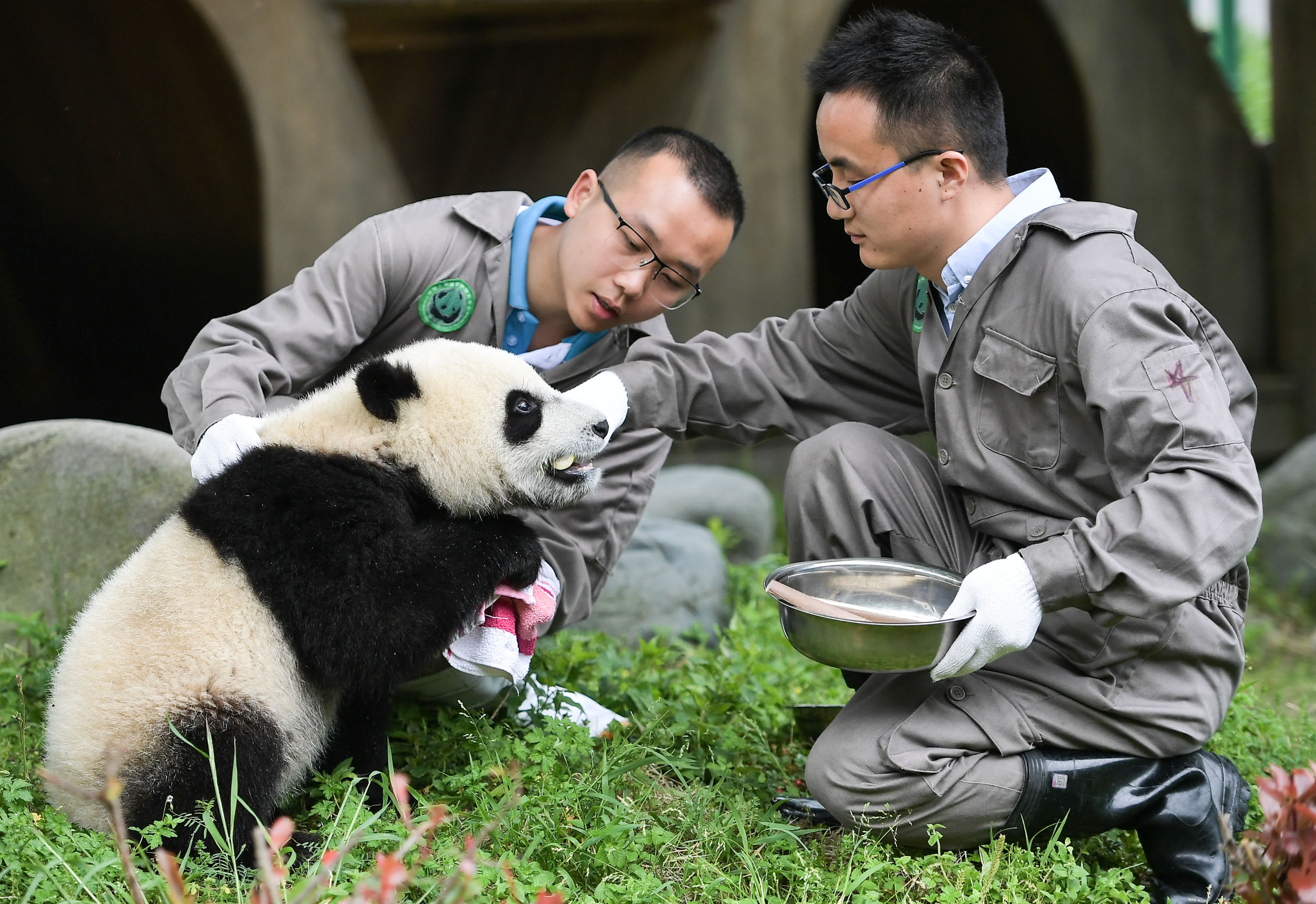 Staff members feed a giant panda in Wolong, southwest China's Sichuan Province, May 26, 2019. (Xinhua/Xue Yubin)