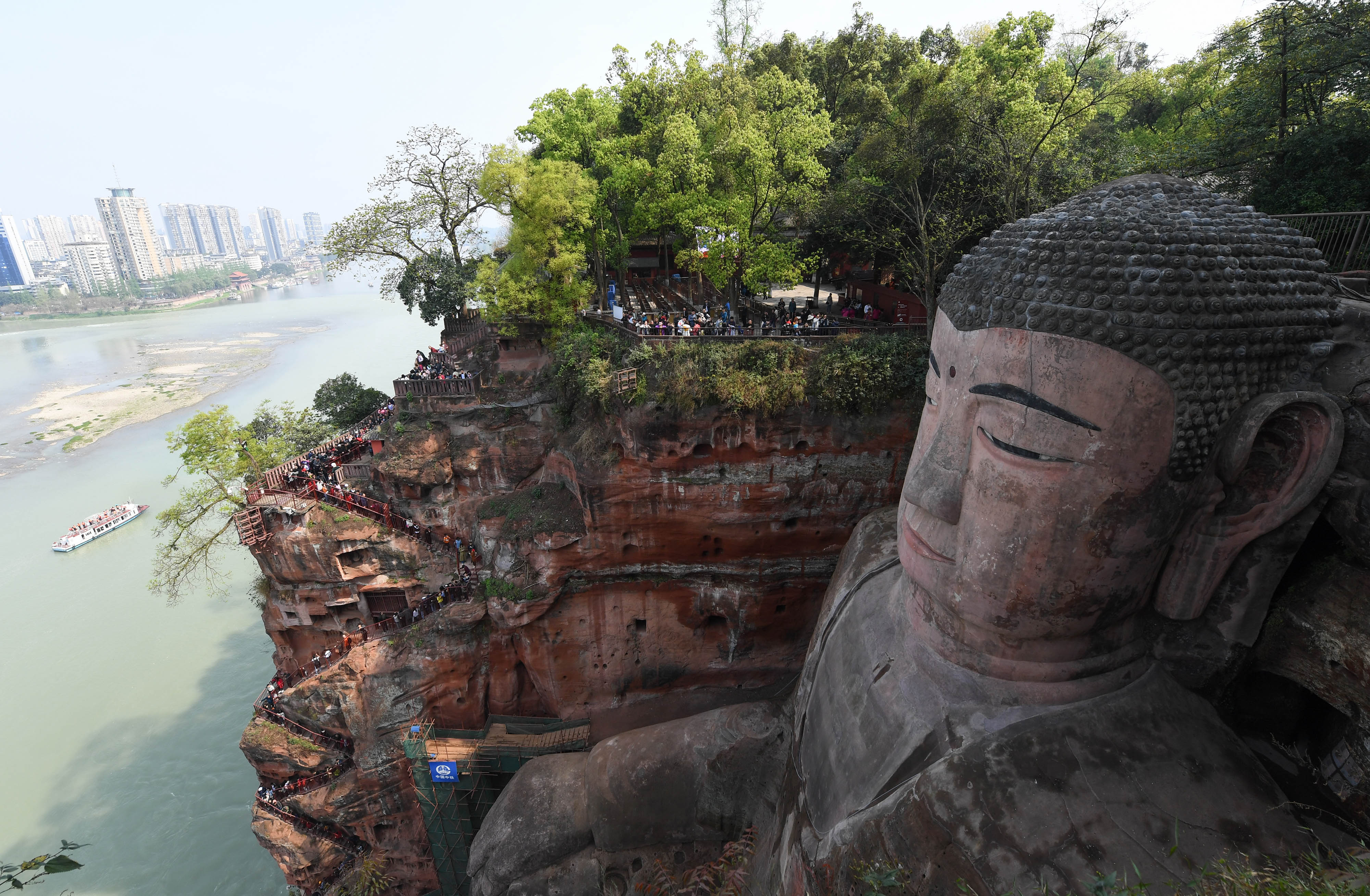 Tourists view the statue of the Leshan Giant Buddha in Leshan City, southwest China's Sichuan Province, April 1, 2019. (Xinhua/Jiang Hongjing)