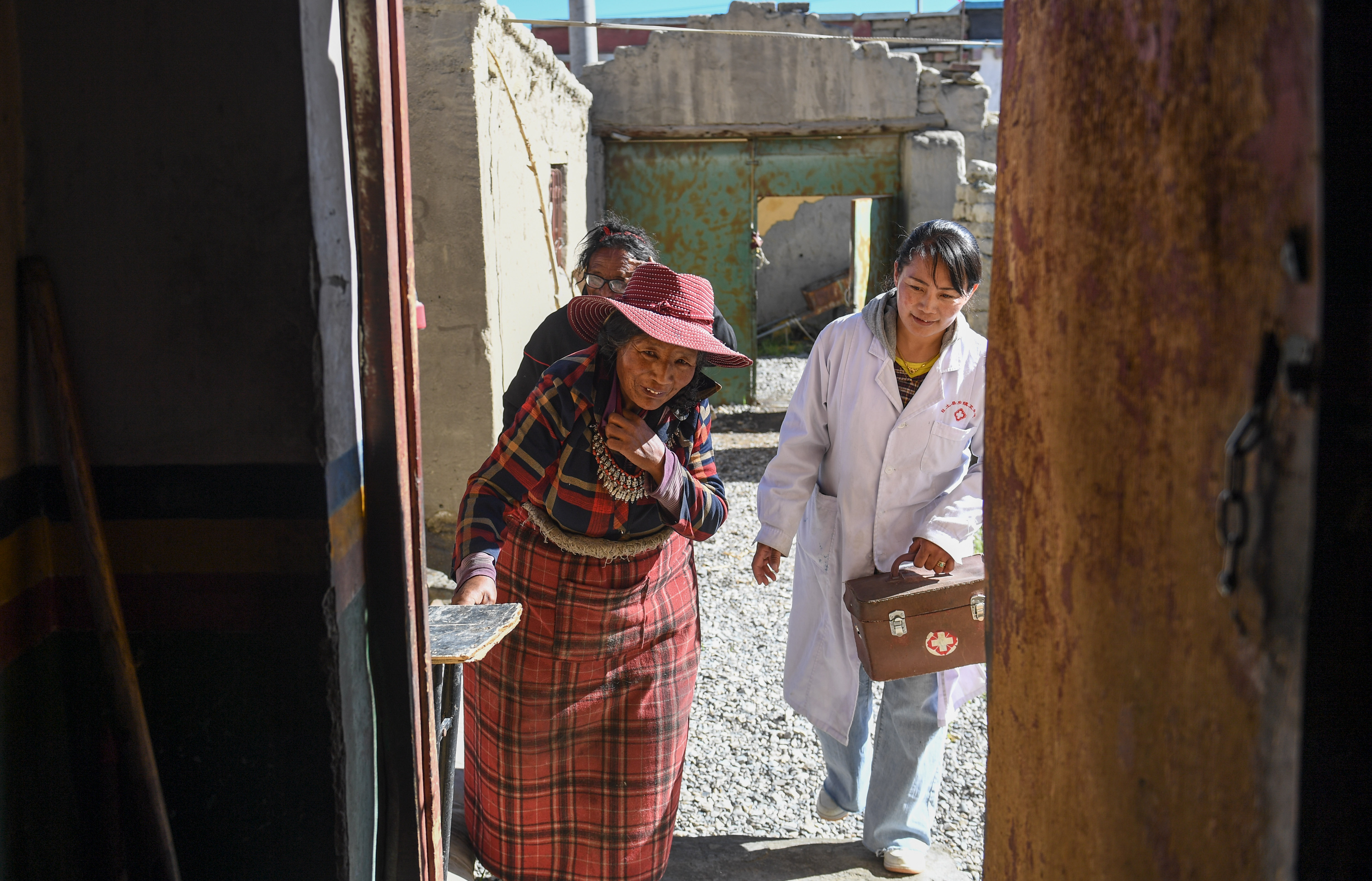 Zhoima (L) makes a home visit to a patient in Wuqang Village, SW China's Tibet Autonomous Region, Aug. 3, 2019. (Xinhua/Jigme Dorje)