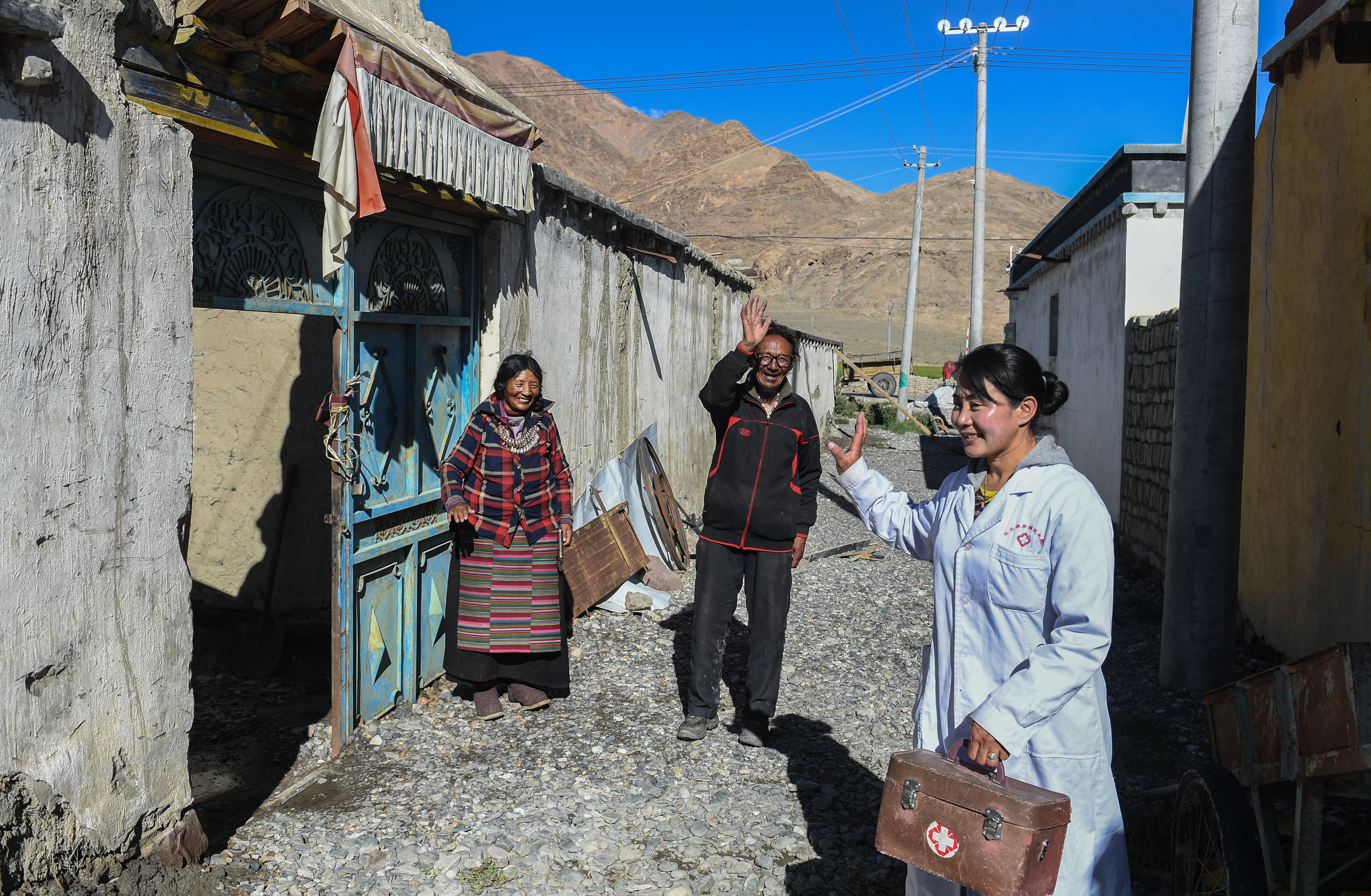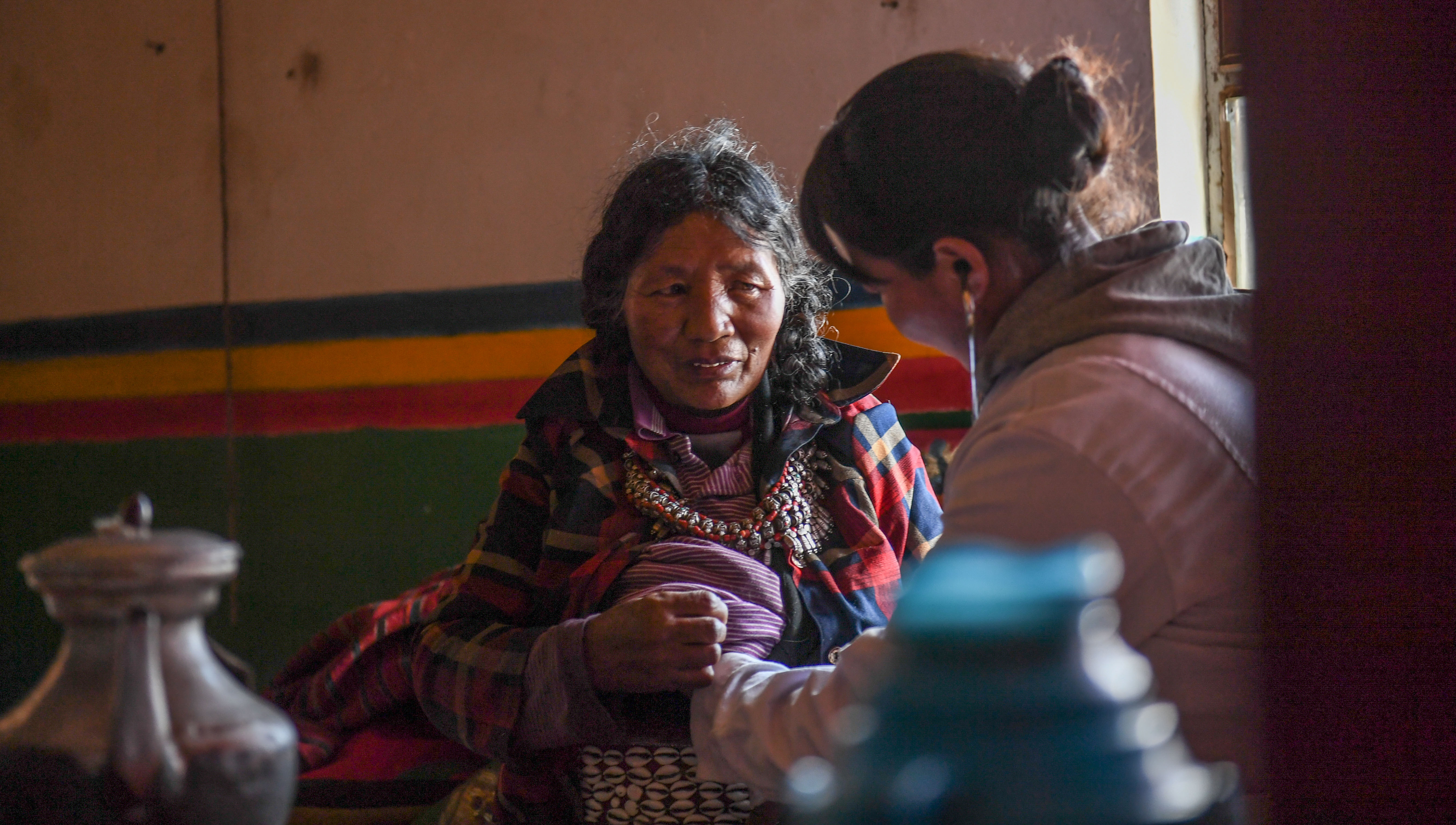 Zhoima (R) makes a home visit in Wuqang Village, SW China's Tibet Autonomous Region, Aug. 3, 2019. (Xinhua/Jigme Dorje)