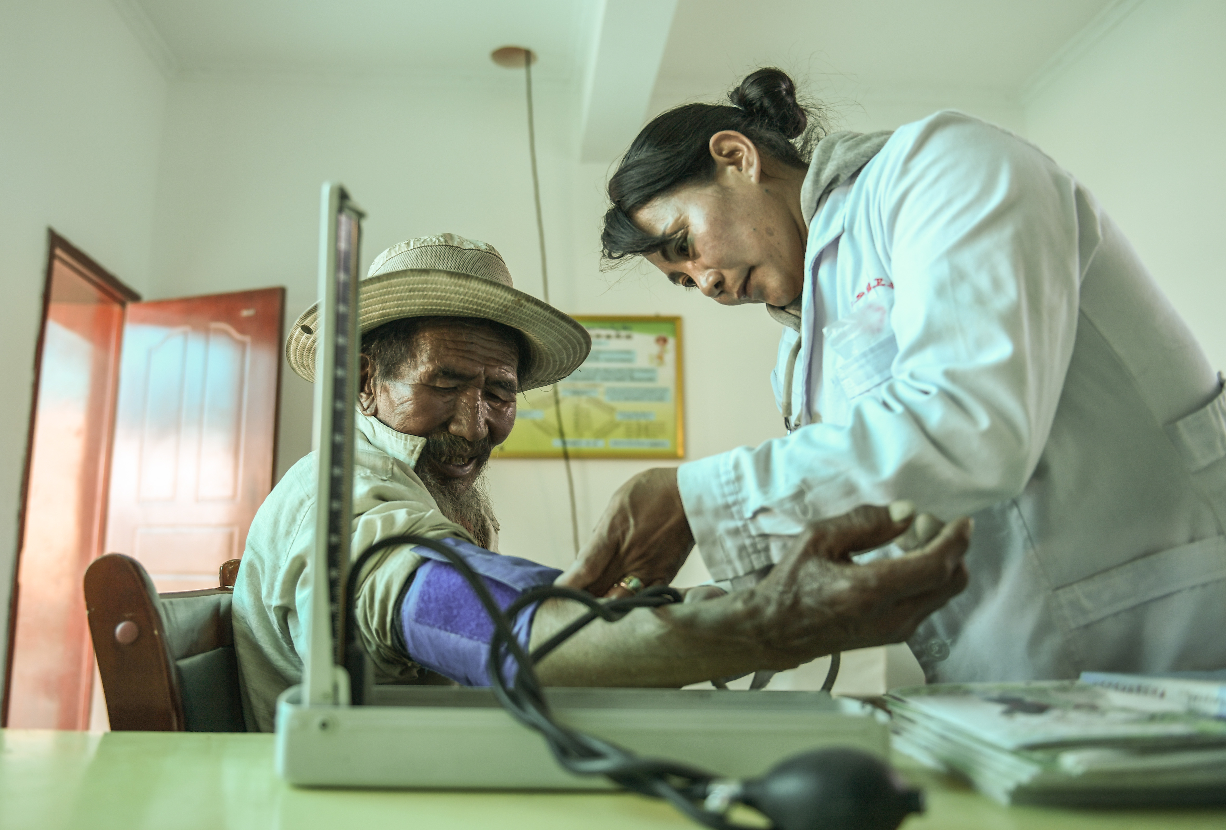 Zhoima (R) conducts a medical checkup for a villager at the health room in Wuqang Village, SW China's Tibet Autonomous Region, Aug. 3, 2019. (Xinhua/Jigme Dorje)