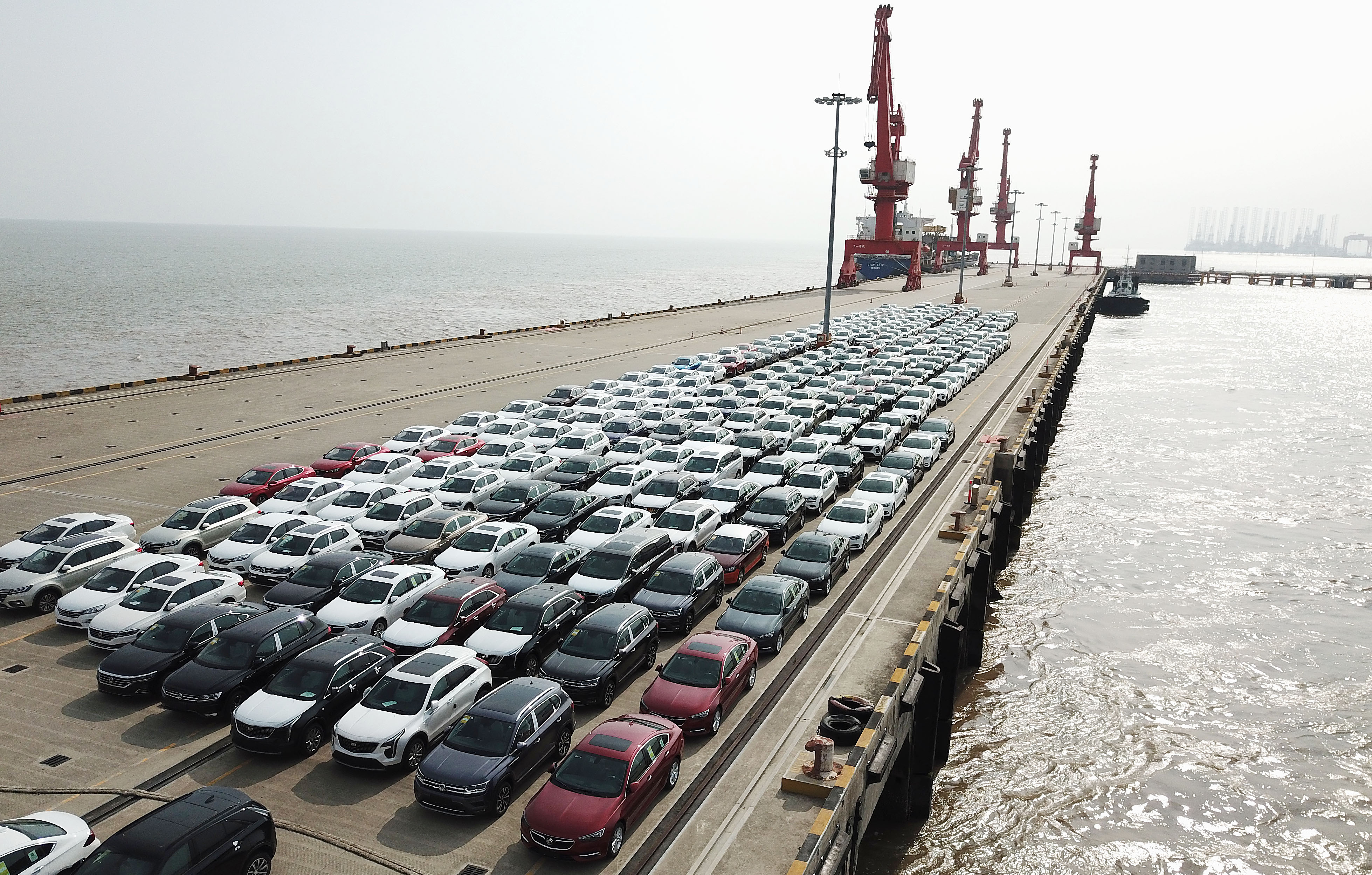 Aerial photo taken on June 27, 2019 shows new cars wating for shipment at a port in the Lingang area in Shanghai, east China. (Xinhua/Fang Zhe)