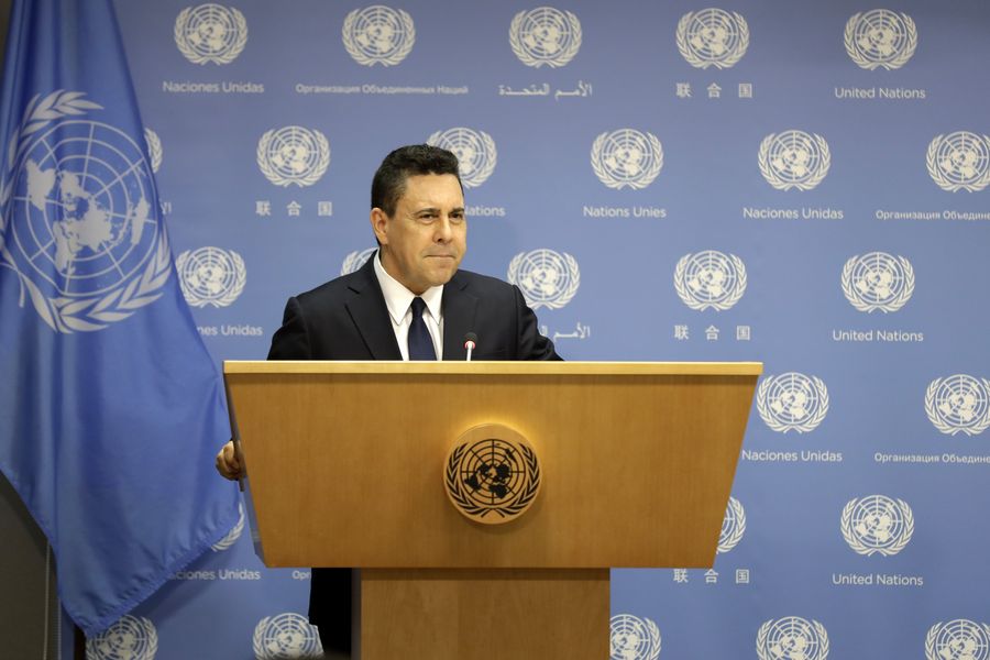 Venezuela's Permanent Representative to the United Nations Samuel Moncada speaks to journalists during a press conference at the UN headquarters in New York, Aug. 6, 2019. (Xinhua/Li Muzi)