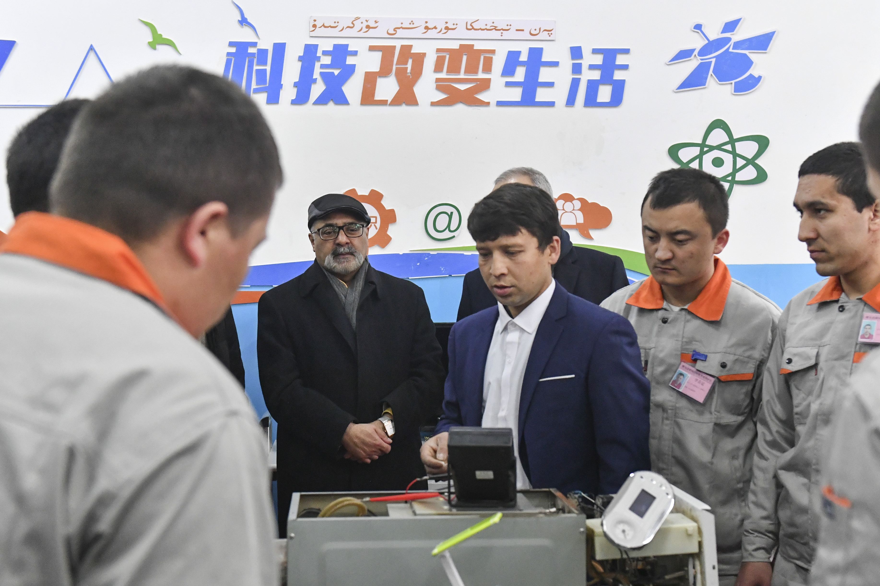 Farukh Akhter Amil (wearing hat), permanent representative of Pakistan to the UN Office at Geneva, visits an electronics training class at the vocational education and training center in Moyu county of Hotan Prefecture, northwest China's Xinjiang Uygur Autonomous Region, Feb. 18, 2019. Senior diplomats from permanent missions of eight countries to the United Nations Office at Geneva visited Xinjiang Uygur Autonomous Region from Feb. 16 to 19 at the invitation of the Chinese Ministry of Foreign Affairs. (Xinhua/Ma Kai)