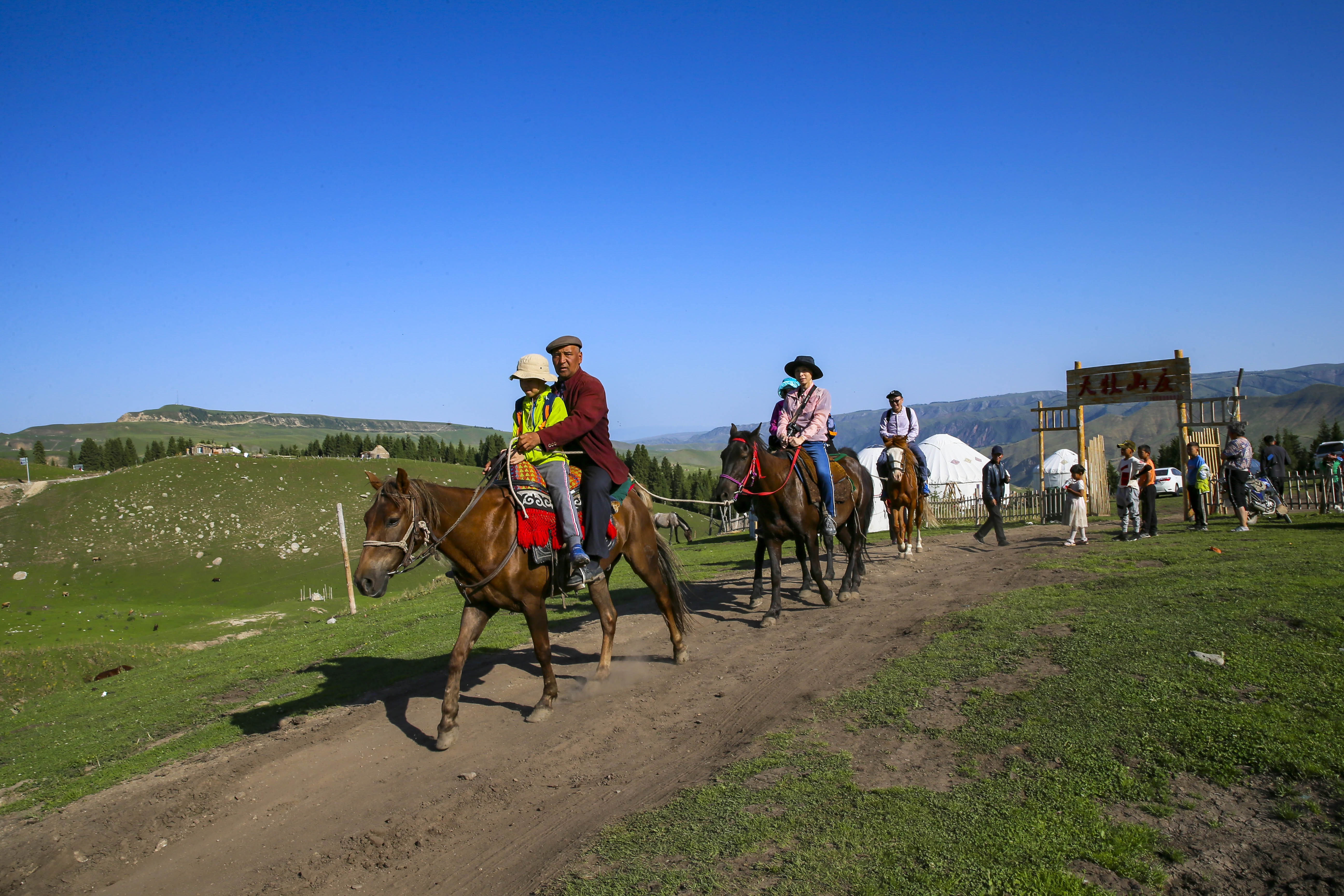 Tourists ride horses at Qiongkushitai Village in Karadala Township in Tekes County, NW China's Xinjiang Uygur Autonomous Region. (Xinhua/Hu Huhu)