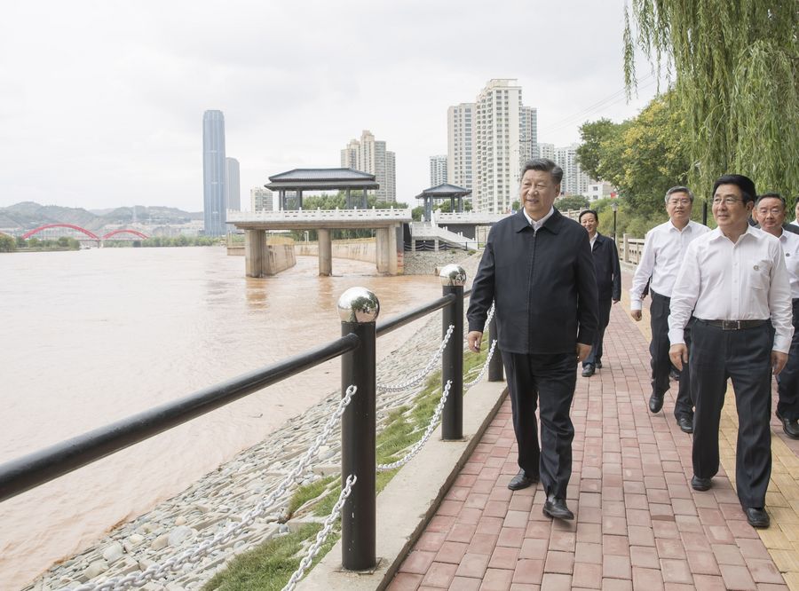 Chinese President Xi Jinping, also general secretary of the CPC Central Committee and chairman of the Central Military Commission, visits a Yellow River management point to learn about the management, protection and flood control project construction of the Yellow River in Lanzhou, northwest China's Gansu Province, Aug. 21, 2019. (Xinhua/Wang Ye)