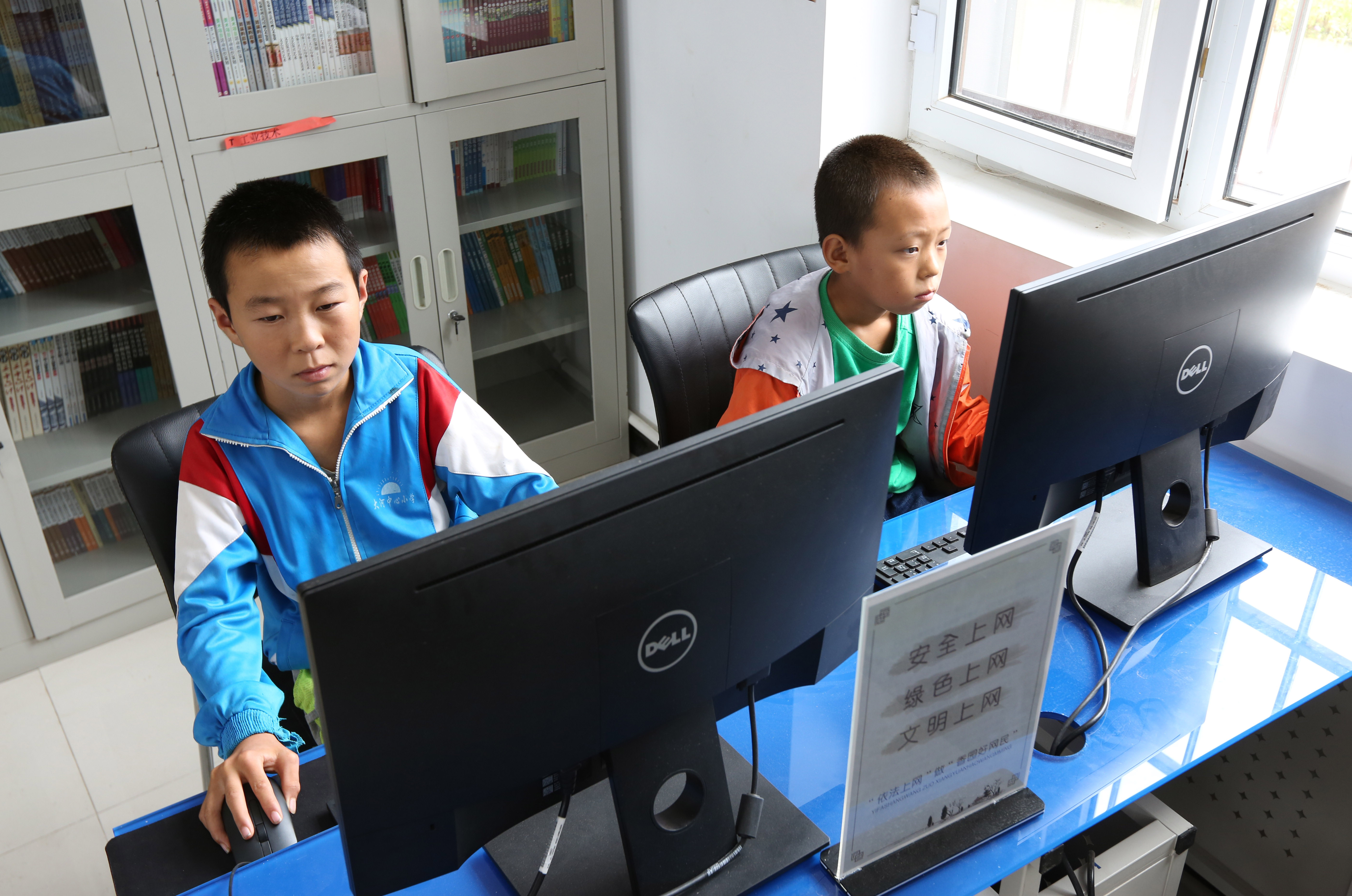 Two pupils study on the Internet in a library in Xiangyuan village of Wuzhong City, northwest China's Ningxia Hui Autonomous Region, Aug. 21, 2019. (Xinhua/Wu Jingdan)