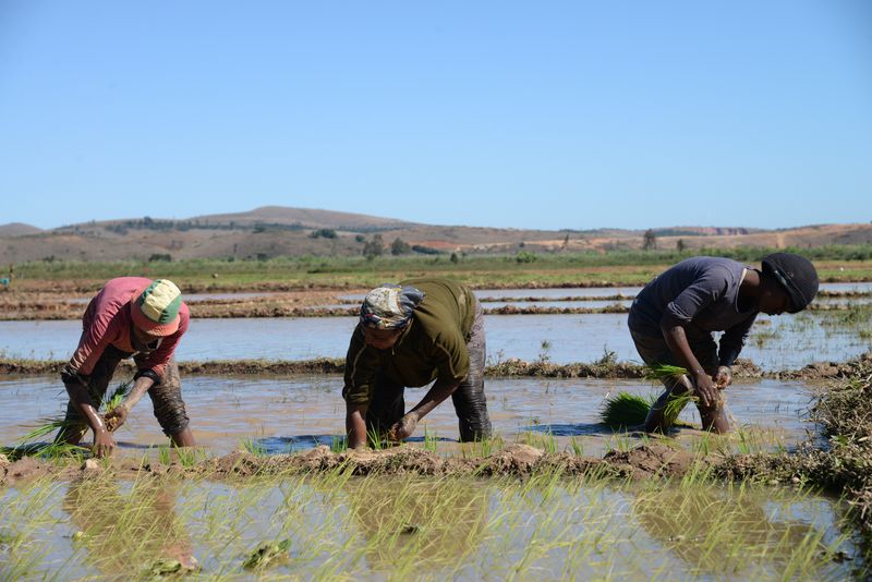 Women plant rice seedlings in Ambatondrazaka, Madagascar, July 22, 2015. (Xinhua/Dong Ruifeng)