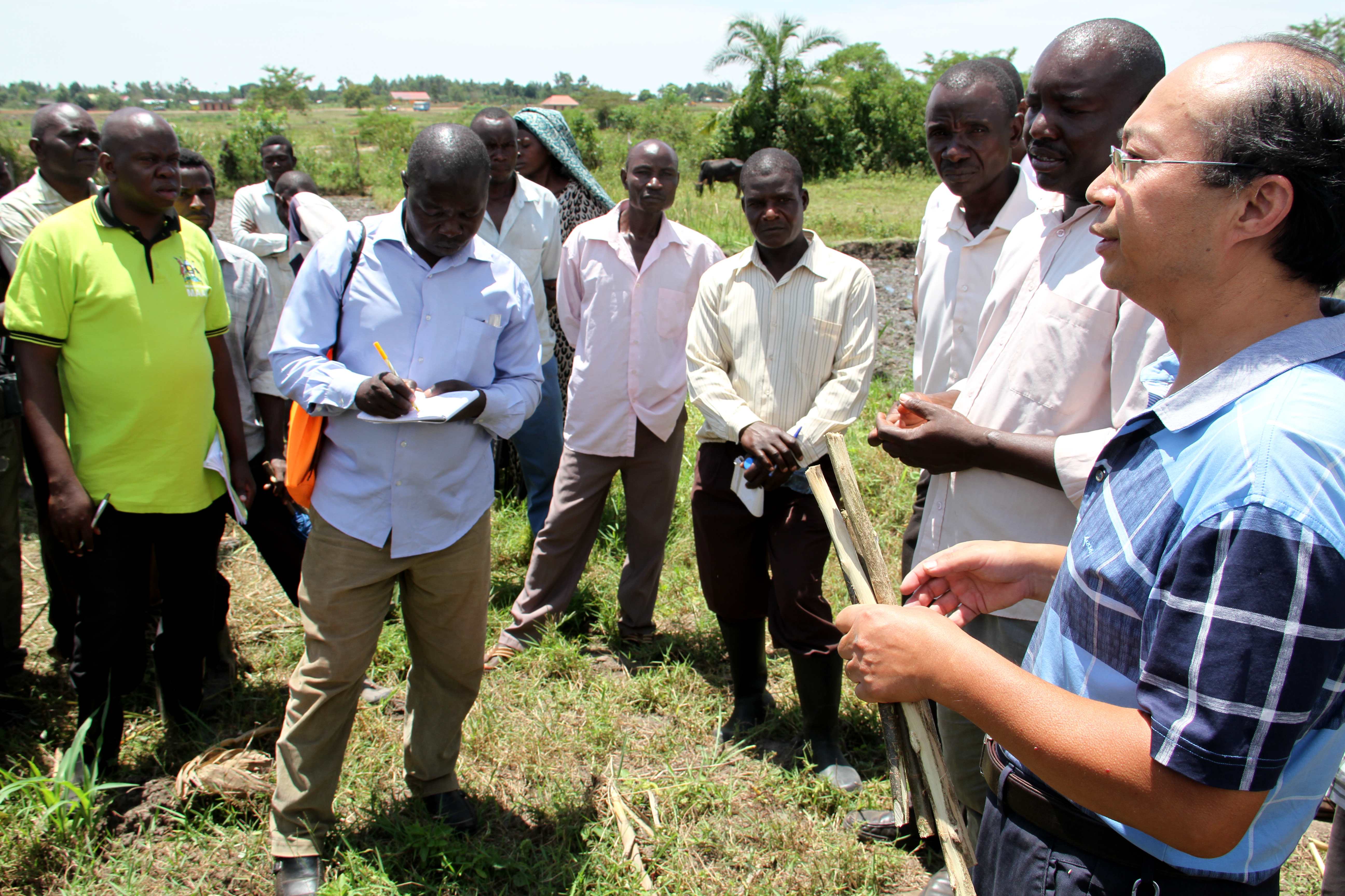 A Chinese cereals expert explains to farmers in the eastern Ugandan district of Budaka how to grow Chinese hybrid rice, Oct. 25, 2016. (Xinhua/Ronald Ssekandi)
