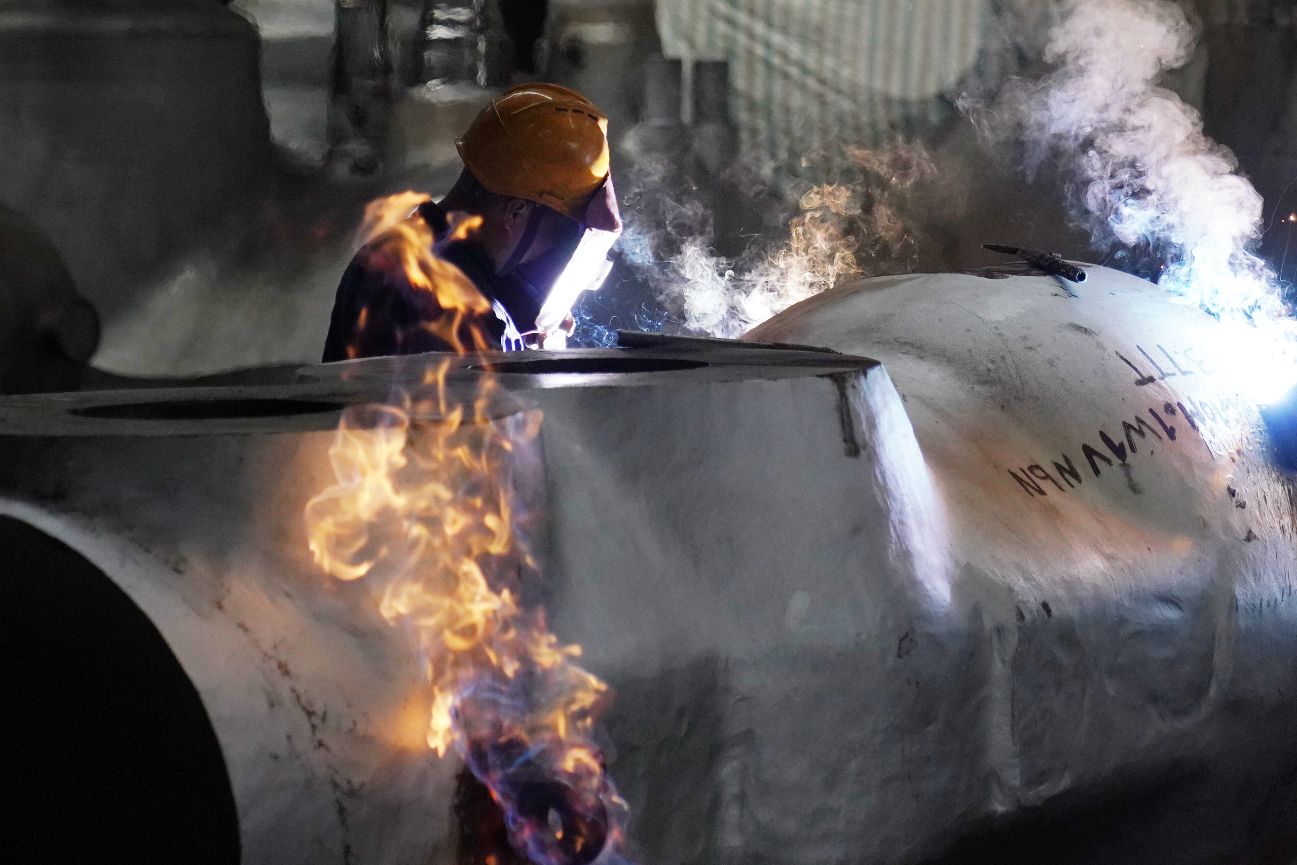 A worker welds components at a factory of Harbin Turbine Company Limited in Harbin, Sept. 3, 2019. (Xinhua/Wang Jianwei)