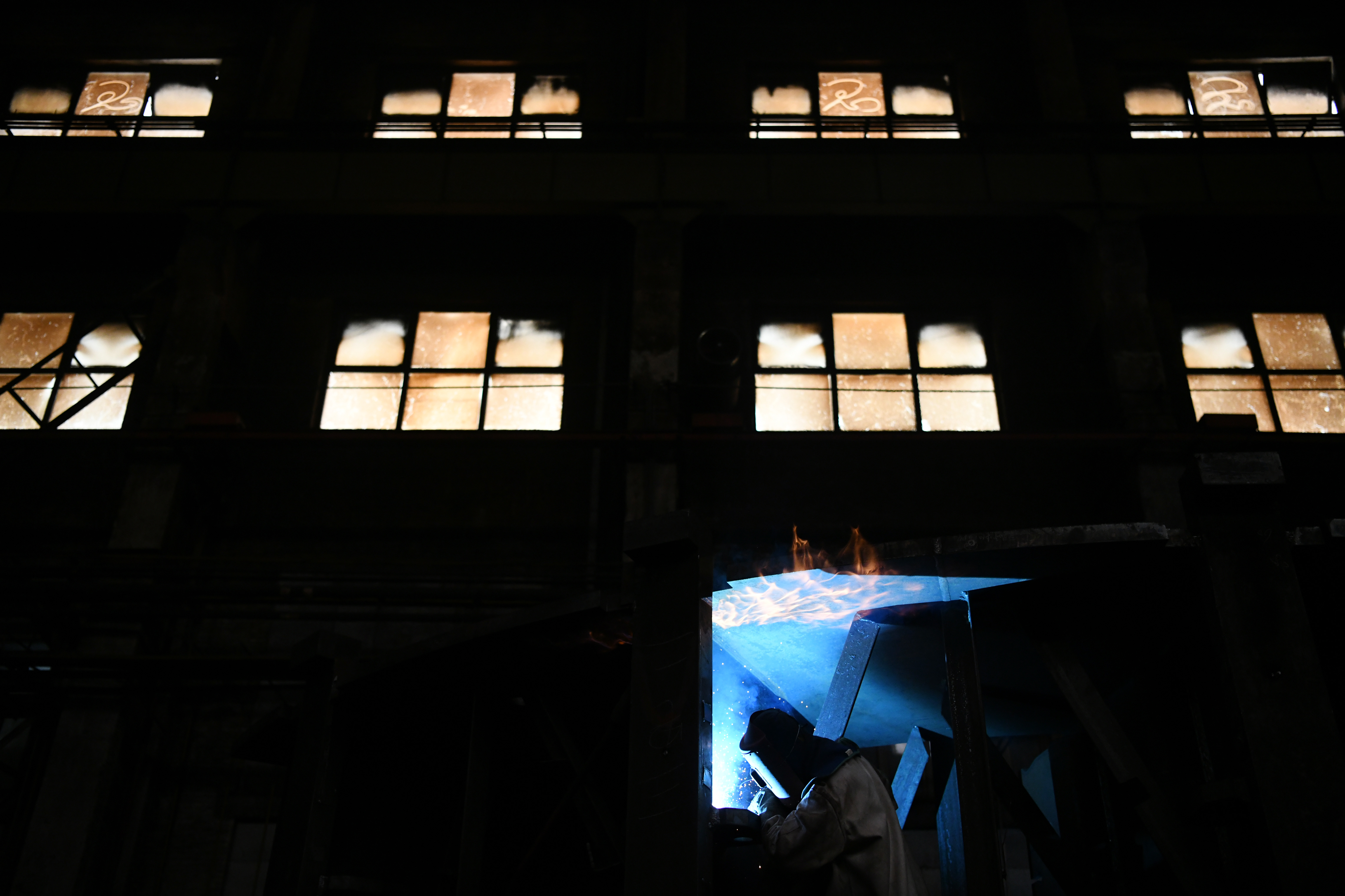 A worker is seen at a boiler production factory of Harbin Boiler Company Limited in Harbin, Sept. 4, 2019. (Xinhua/Wang Jianwei)
